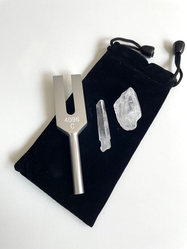 チューナーで水晶を軽くたたくと、透明感のある美しい音が空間中に響きわたります。